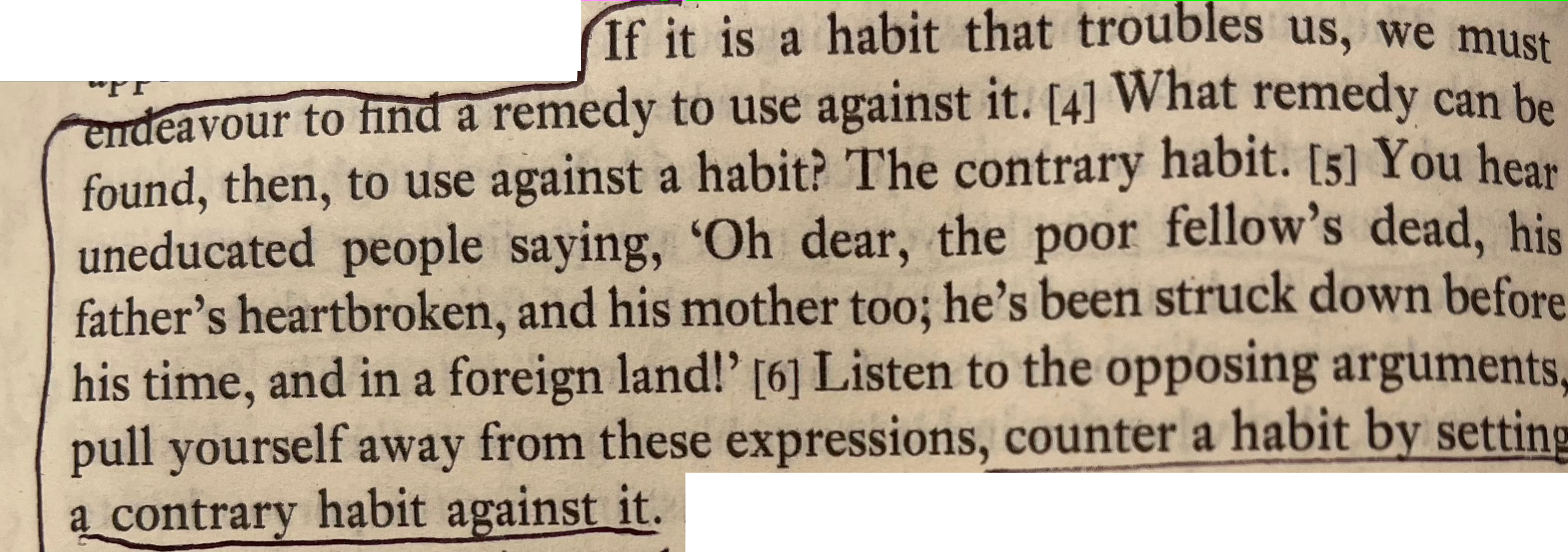 His broader point about breaking a bad habit by setting a contrary habit was no doubt groundbreaking for his time. Might as well read Epictetus rather than whatever “Habit” book is trending in the airport bookstore this decade.